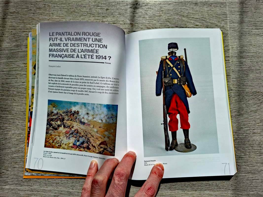Ce catalogue nous invite à découvrir la place des couleurs et à en comprendre les usages dans la culture matérielle de la Grande Guerre. Le conflit marque, dans ce domaine aussi, la fin d’un monde : les couleurs vives des uniformes français, qui donnaient si belle allure aux défilés militaires, allaient bientôt disparaître dans l’uniformité du bleu horizon.