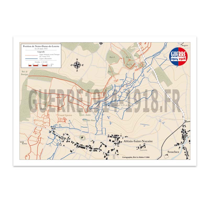 Durant trois semaines de combats ininterrompus, sous un déluge d'artillerie et dans la boue, les lignes ne cessent de fluctuer. Cette carte de précision restitue la réalité brutale de cette guerre d'usure : elle met en lumière le recul partiel des positions françaises face aux violentes contre-attaques allemandes entre le Bois des Boches et les ruines de Notre-Dame-de-Lorette.